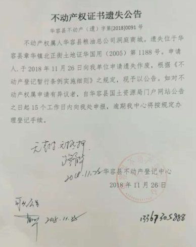 不动产权证书遗失公告【国有土地证(华容县粮油总公司洞庭商城)】
