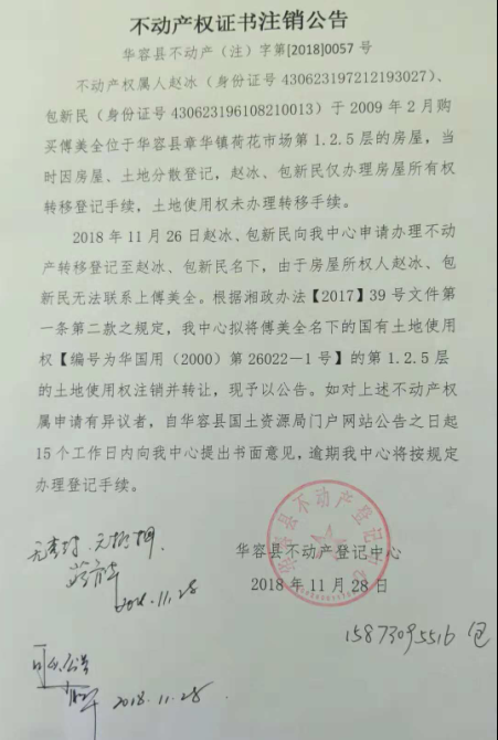 不动产权证书注销公告【国有土地证(傅美全转赵冰 包新民)】