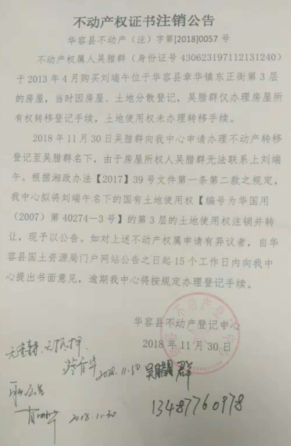 不动产权证书注销公告【国有土地证(刘端午转吴腊群)】