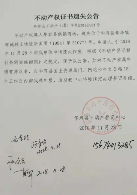 不动产权证书遗失公告【国有土地证(华容县供销商场)】