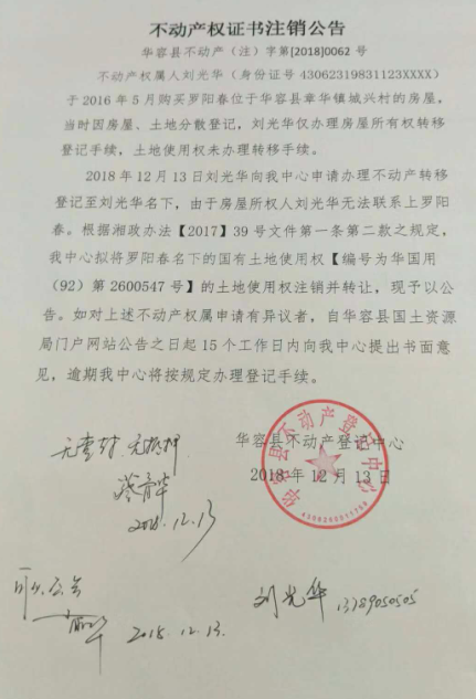 不动产权证书注销公告【国有土地证(罗阳春转刘光华)】