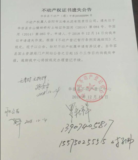 不动产权证书遗失公告【国有土地证(岳阳市兰峰水泥有限责任公司)】