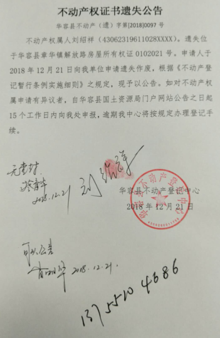 不动产权证书遗失公告【房屋所有权证(刘绍祥)】