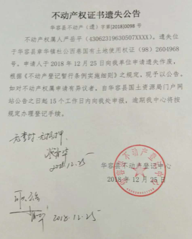 不动产权证书遗失公告【国有土地证(严岳平)】