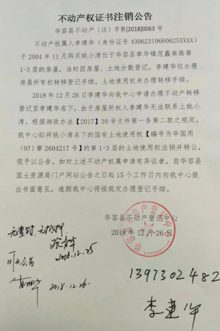 不动产权证书注销公告【国有土地证(姚小清转李建华)】