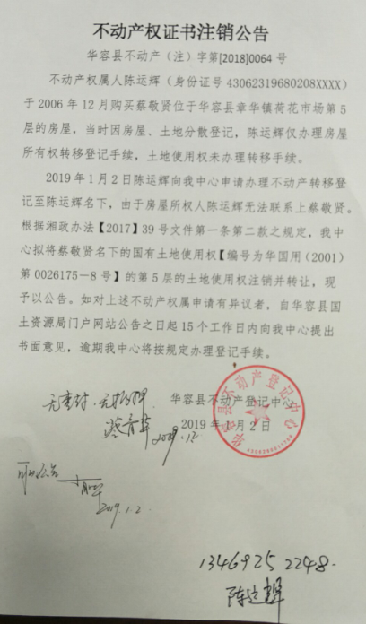 不动产权证书注销公告【国有土地证(蔡敬贤转陈运辉)】