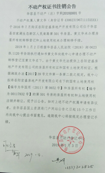 不动产权证书注销公告【国有土地证(岳阳宏盛房地产开发有限公司转黄文华)】