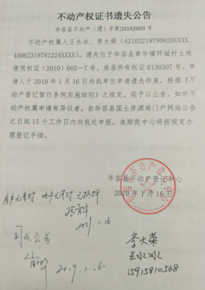不动产权证书遗失公告【土地使用权证 房屋所有权证(王水冰 李大荣)】