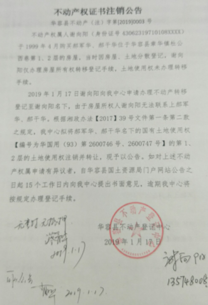 不动产权证书注销公告【国有土地证(谢向阳转郝军华 郝干华)】