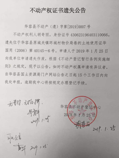 不动产权证书遗失公告【土地使用权证(胡奇丽)】