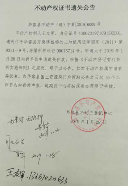 不动产权证书遗失公告【土地使用权证 房屋所有权证(王友军)】