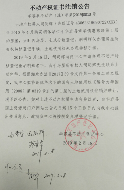 不动产权证书注销公告【国有土地证(胡体华转胡明辉)】