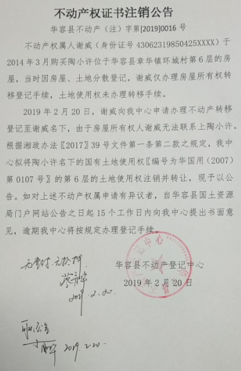 不动产权证书注销公告【国有土地证(陶小许转谢威)】