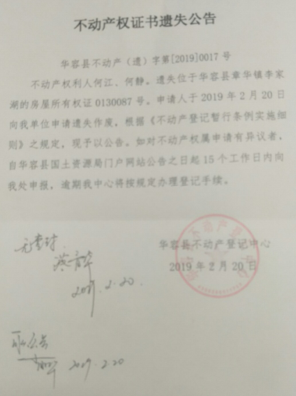 不动产权证书遗失公告【房屋所有权证(何江 何静)】