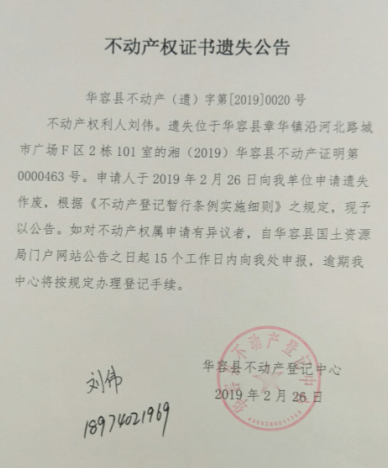 不动产权证书遗失公告【不动产证明(刘伟)】