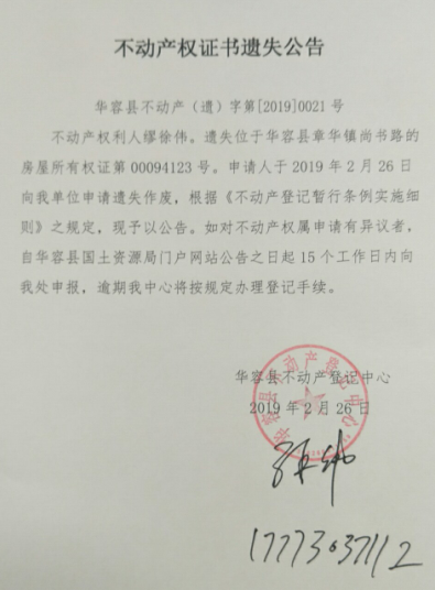 不动产权证书遗失公告【房屋所有权证(缪徐伟)】
