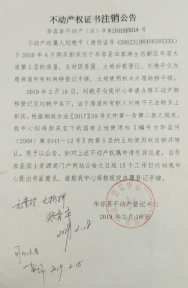 不动产权证书注销公告【土地使用权证(彭庆转刘艳平)】