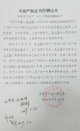 不动产权证书注销公告【土地使用权证(王文海转李必强)】