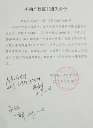 不动产权证书遗失公告【土地使用权证,房屋所有权证(陈雪兰)】