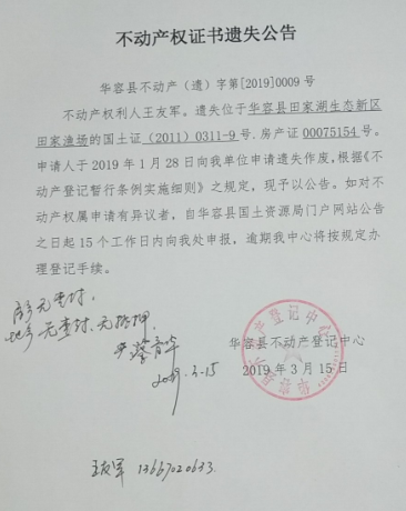 不动产权证书遗失公告【国土证 房产证(王友军)】