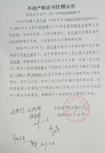 不动产权证书注销公告【土地使用权证(胡美霞转李凡喜)】