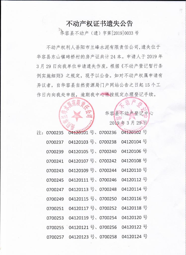 不动产权证书遗失公告【房产证(岳阳市兰峰水泥有限责任公司)】
