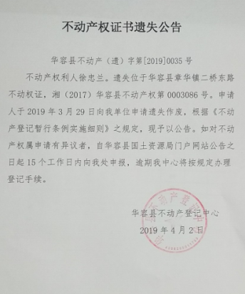 不动产权证书遗失公告【不动产权证(徐忠兰)】