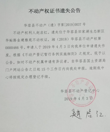不动产权证书遗失公告【不动产权证(赵启红)】