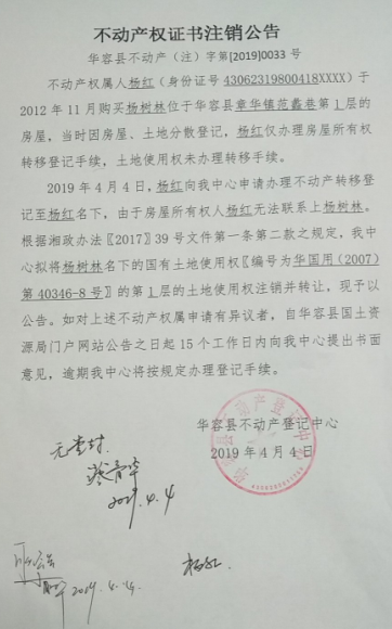 不动产权证书注销公告【土地使用权证(杨树林转杨红)】