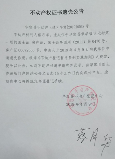 不动产权证书遗失公告【国土证 房产证(蔡月华)】