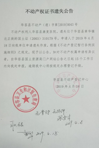 不动产权证书遗失公告【国土证(华容县康复医院)】