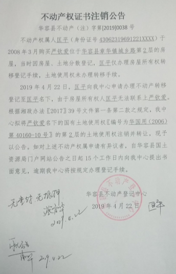 不动产权证书注销公告【土地使用权证(严钦爱转匡平)】