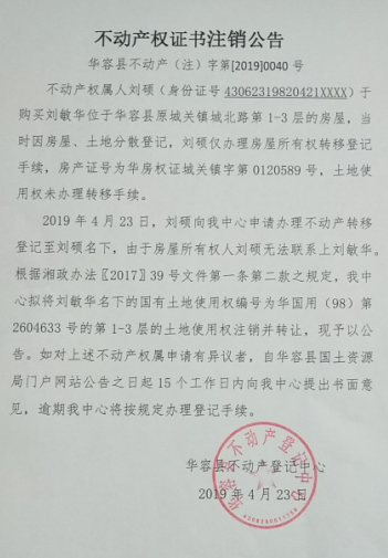 不动产权证书注销公告【土地使用权证(刘敏华转刘硕)】