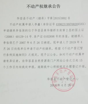 不动产权继承公告【国土证 房产证(李佳保转李鑫)】