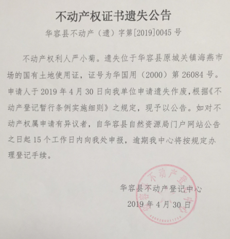 不动产权证书遗失公告【国有土地使用权证(严小菊)】