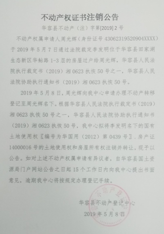 不动产权证书注销公告【土地使用权证 房屋所有权证(李发明转周光辉)】