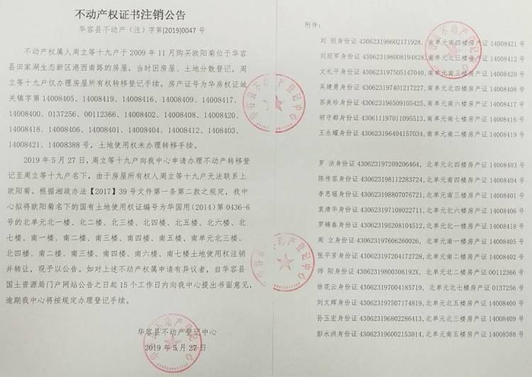 不动产权证书注销公告【土地使用权证(欧阳菊转周立等十九户)】