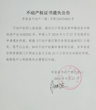 不动产权证书遗失公告【房产证(徐洪滨)】