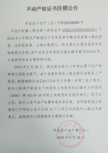不动产权证书注销公告【土地使用权证(严新国转陈光荣)】