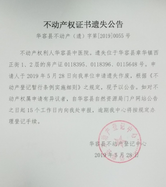 不动产权证书遗失公告【房产证(华容县中医院)】