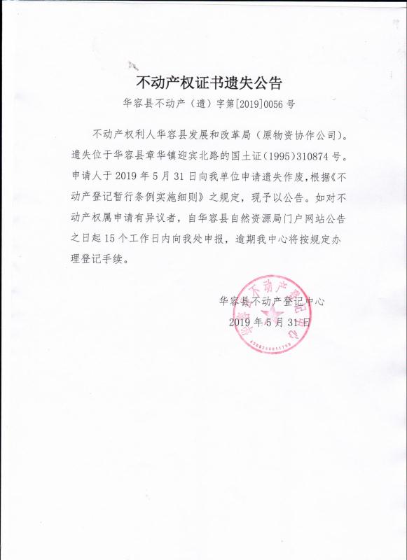 不动产权证书遗失公告【国土证(华容县发展和改革局)】
