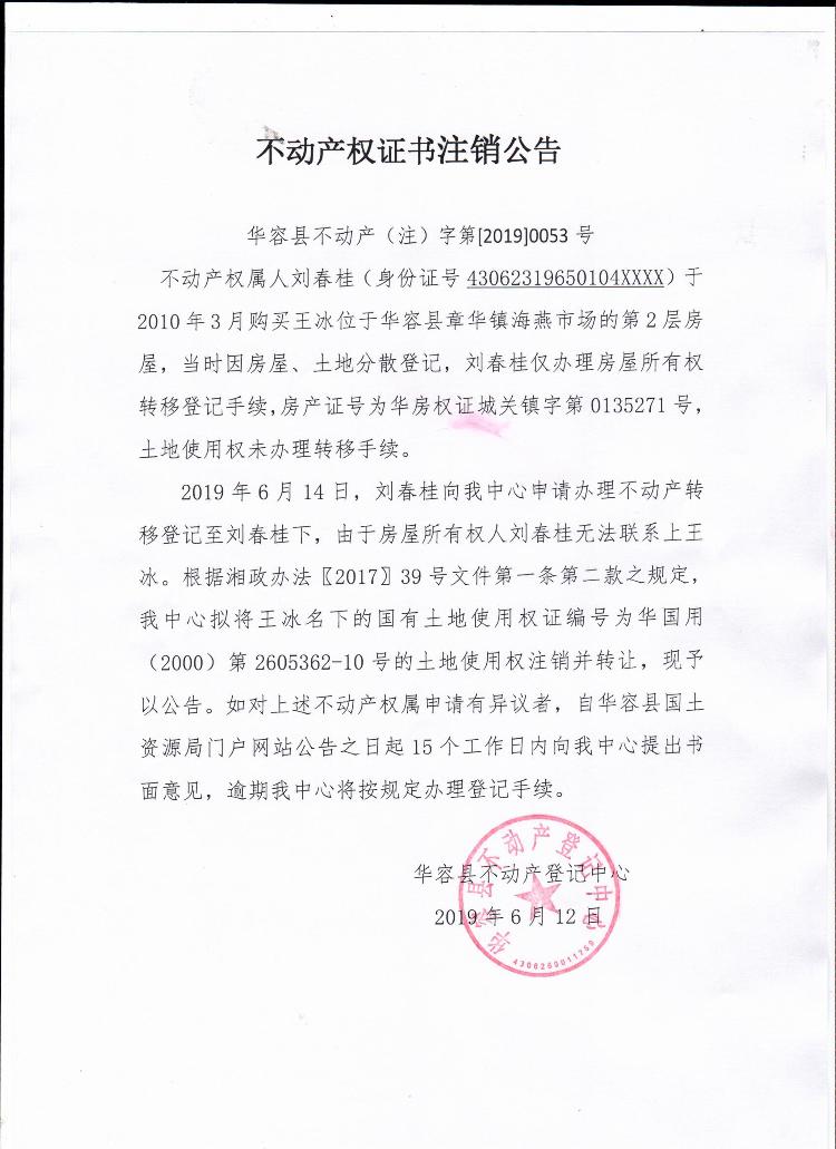 不动产权证书注销公告【土地使用权证(王冰转刘春桂)】