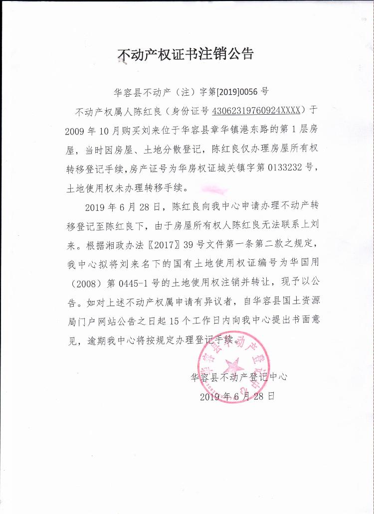 不动产权证书注销公告【土地使用权证(陈红良转刘来)】