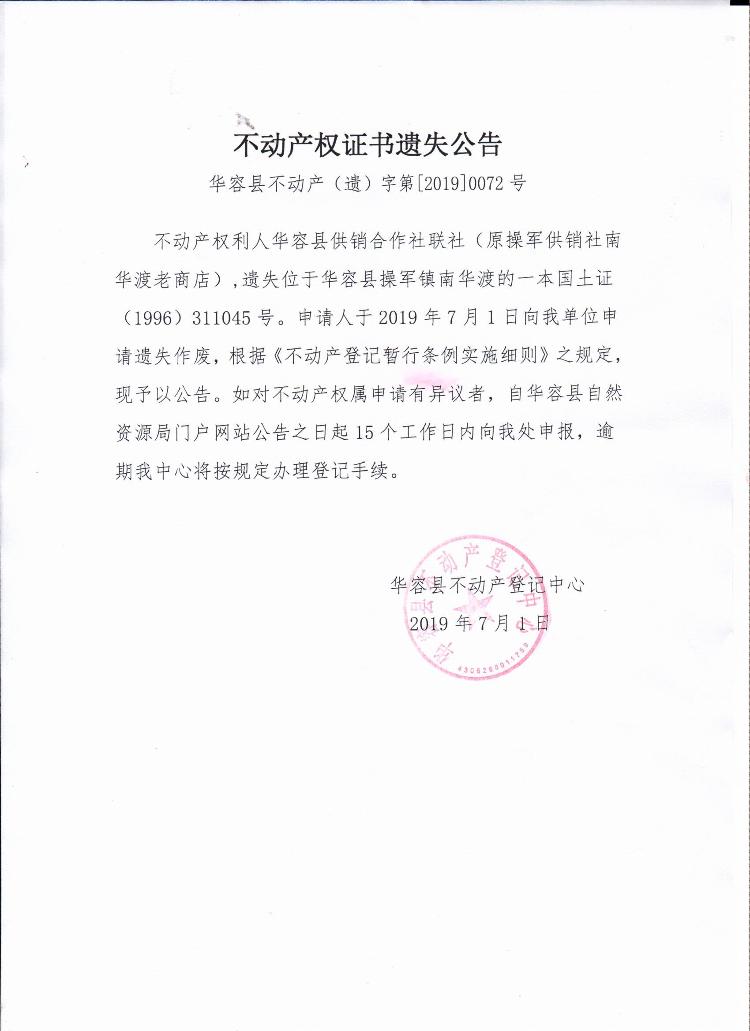 不动产权证书遗失公告【国土证(华容县供销合作社联社)】