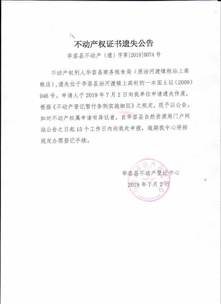 不动产权证书遗失公告【国土证(华容县商务粮食局)治河渡粮站】