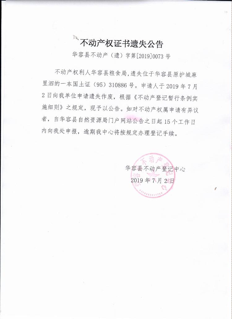 不动产权证书遗失公告【国土证(华容县商务粮食局)护城】