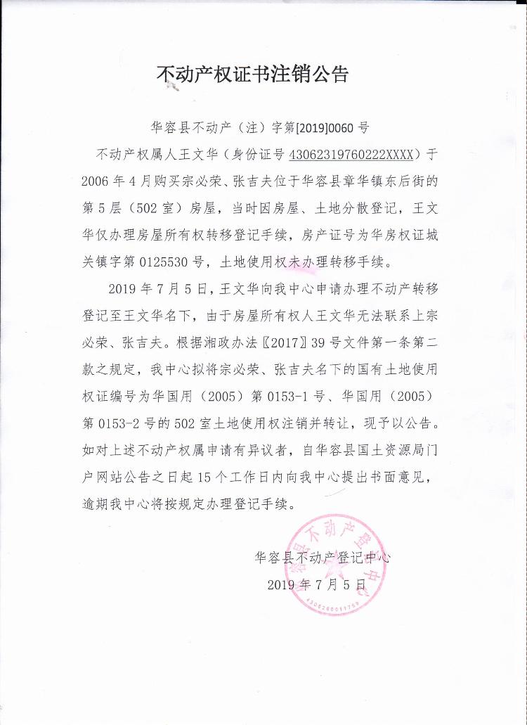 不动产权证书注销公告【土地使用权证(宗必荣、张吉夫转王文华)】