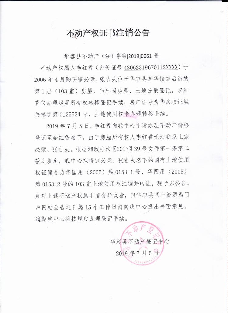 不动产权证书注销公告【土地使用权证(宗必荣、张吉夫转李红香)】