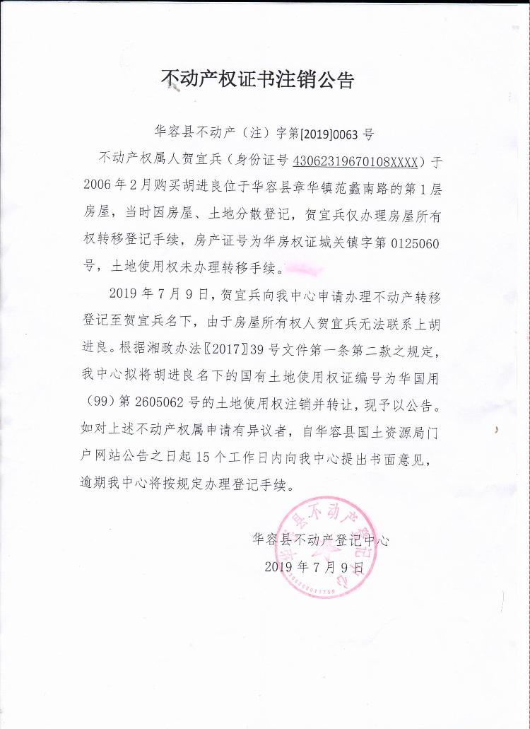 不动产权证书注销公告【土地使用权证(胡进良转贺宜兵)】