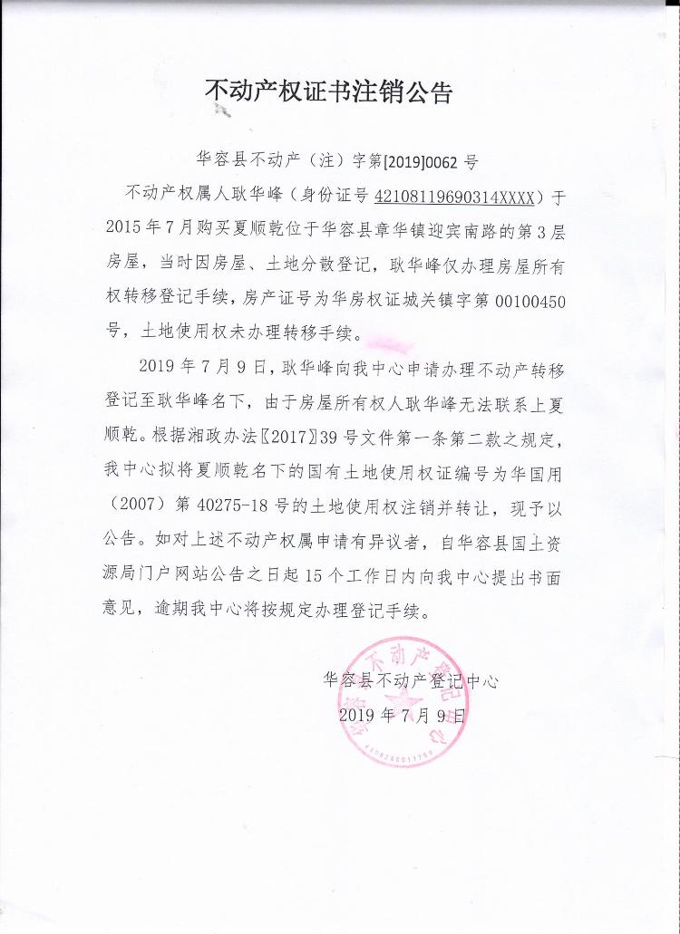 不动产权证书注销公告【土地使用权证(夏顺乾转耿华峰)】
